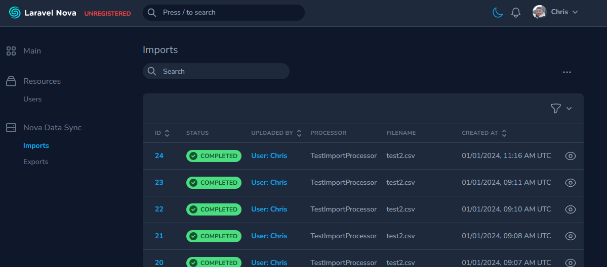 This will dispatch the jobs necessary to handle the import. You'll also be able to see the progress of the import in the Nova Data Sync tool.