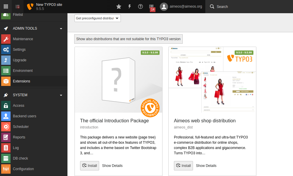 Alternatively, you can download the Aimeos TYPO3 distribution package from the TER.