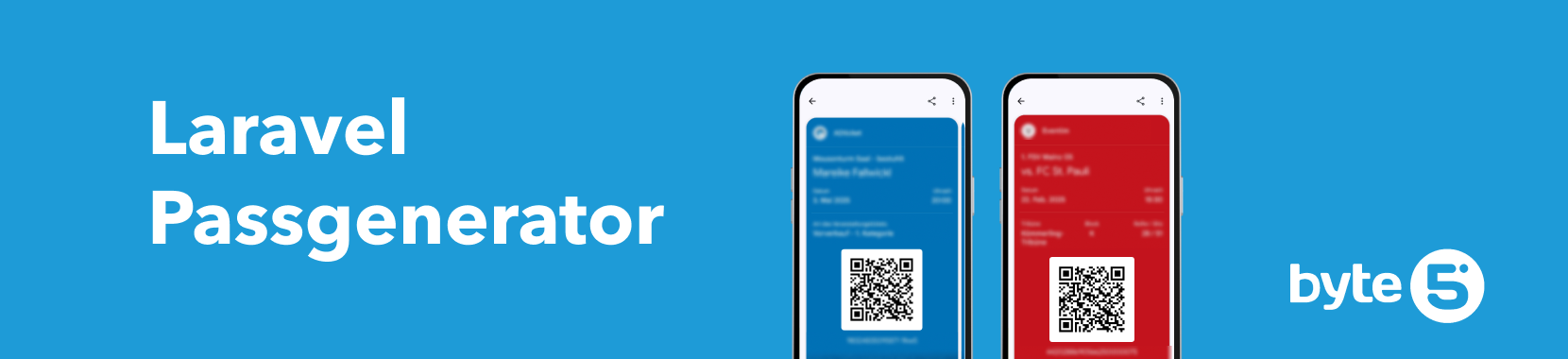 use Byte5\PassGenerator; //... $pass_identifier = 'somekindofid'; // This, if set, it would allow for retrieval later on of the created Pass $pass = new PassGenerator($pass_identifier); $pass_definition = [ "description" => "description", "formatVersion" => 1, "organizationName" => "organization", "passTypeIdentifier"=> "pass.com.example.appname", "serialNumber" => "123456", "teamIdentifier" => "teamid", "foregroundColor" => "rgb(99, 99, 99)", "backgroundColor" => "rgb(212, 212, 212)", "barcode" => [ "message" => "encodedmessageonQR", "format" => "PKBarcodeFormatQR", "altText" => "altextfortheQR", "messageEncoding"=> "utf-8", ], "boardingPass" => [ "headerFields" => [ [ "key" => "destinationDate", "label" => "Trip to: BCN-SANTS", "value" => "15/09/2015" ] ], "primaryFields" => [ [ "key" => "boardingTime", "label" => "MURCIA", "value" => "13:54", "changeMessage" => "Boarding time has changed to %@" ], [ "key" => "destination", "label" => "BCN-SANTS", "value" => "21:09" ] ], "secondaryFields" => [ [ "key" => "passenger", "label" => "Passenger", "value" => "J.DOE" ], [ "key" => "bookingref", "label" => "Booking Reference", "value" => "4ZK6FG" ] ], "auxiliaryFields" => [ [ "key" => "train", "label" => "Train TALGO", "value" => "00264" ], [ "key" => "car", "label" => "Car", "value" => "009" ], [ "key" => "seat", "label" => "Seat", "value" => "04A" ], [ "key" => "classfront", "label" => "Class", "value" => "Tourist" ] ], "backFields" => [ [ "key" => "ticketNumber", "label" => "Ticket Number", "value" => "7612800569875" ], [ "key" => "passenger-name", "label" => "Passenger", "value" => "John Doe" ], [ "key" => "classback", "label" => "Class", "value" => "Tourist" ] ], "locations" => [ [ "latitude" => 37.97479, "longitude" => -1.131522, "relevantText" => "Departure station" ] ], "transitType" => "PKTransitTypeTrain" ], ]; $pass->setPassDefinition($pass_definition); // Definitions can also be set from a JSON string // $pass->setPassDefinition(file_get_contents('/path/to/pass.json)); // Add assets to the PKPass package $pass->addAsset(base_path('resources/assets/wallet/background.png')); $pass->addAsset(base_path('resources/assets/wallet/thumbnail.png')); $pass->addAsset(base_path('resources/assets/wallet/icon.png')); $pass->addAsset(base_path('resources/assets/wallet/logo.png')); $pkpass = $pass->create();