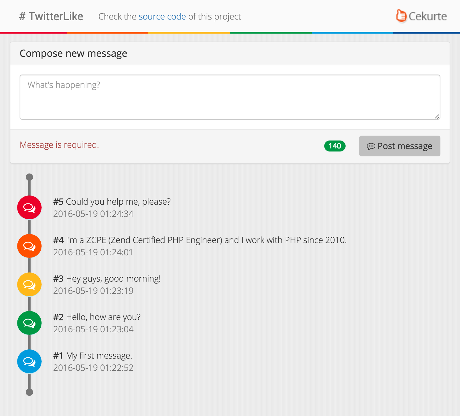 [ { "id":5, "created_at":"2016-05-19 01:24:34", "message":"Could you help me, please?" }, { "id":4, "created_at":"2016-05-19 01:24:01", "message":"I'm a ZCPE (Zend Certified PHP Engineer) and I work with PHP since 2010." }, { "id":3, "created_at":"2016-05-19 01:23:19", "message":"Hey guys, good morning!" }, { "id":2, "created_at":"2016-05-19 01:23:04", "message":"Hello, how are you?" }, { "id":1, "created_at":"2016-05-19 01:22:52", "message":"My first message." } ]