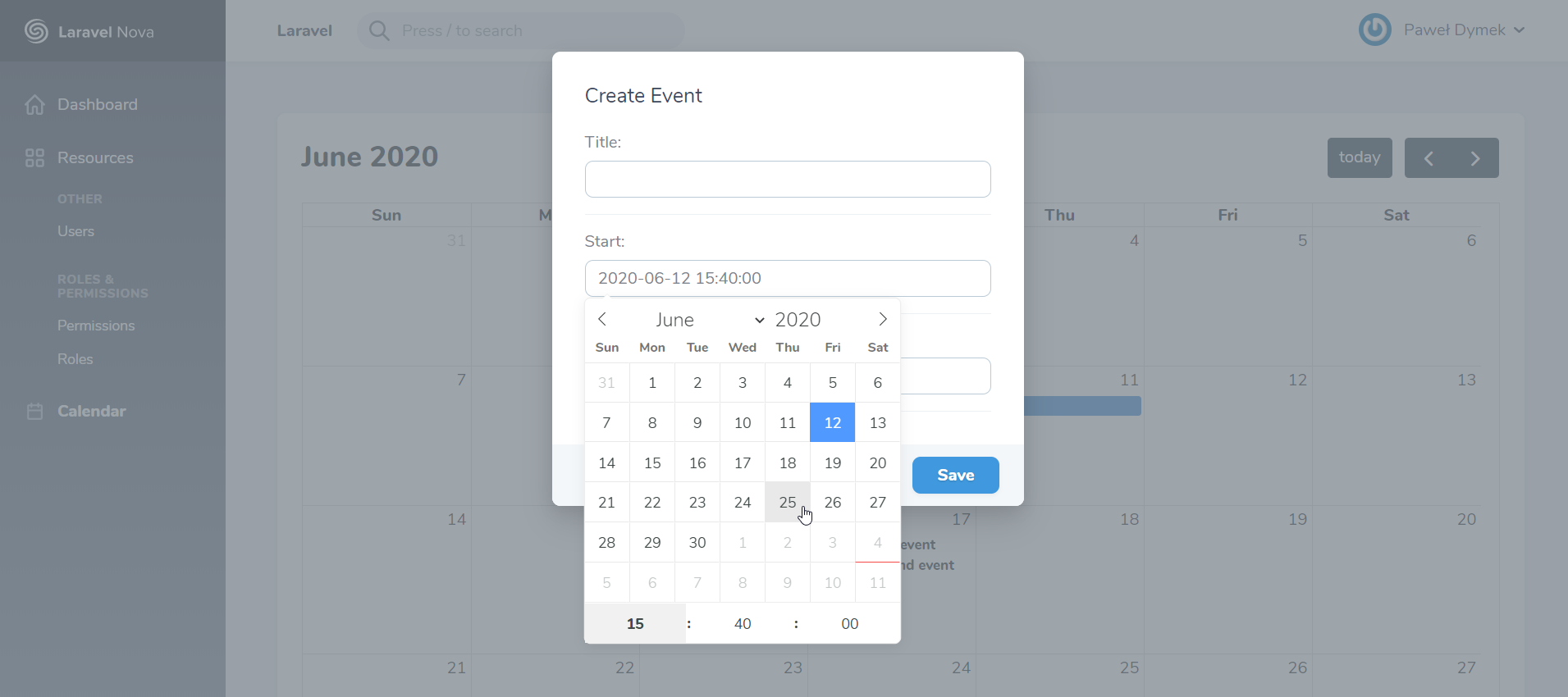 This is a package for Laravel Nova which allows you to create, update and delete events on the calendar. It also has a Google Calendar integration.