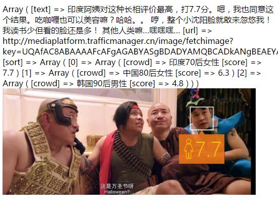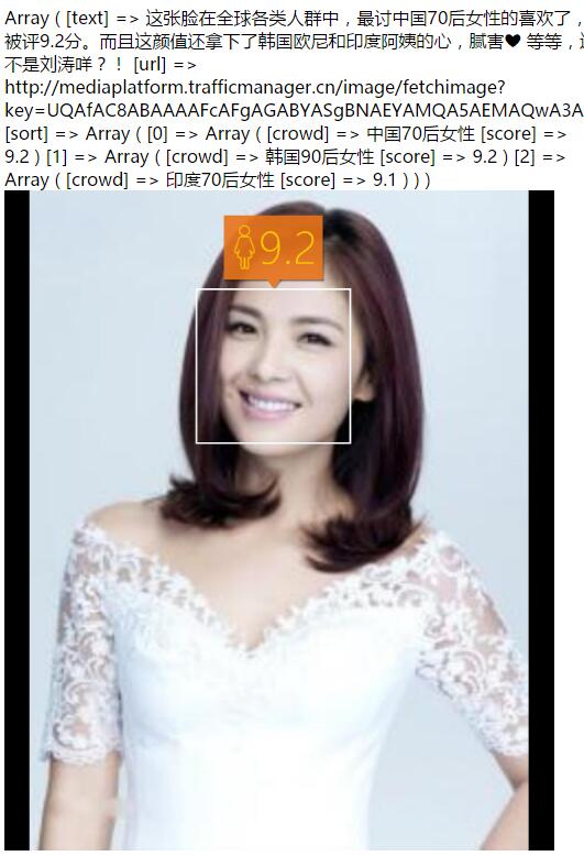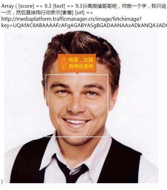 <?php $face = new \Hanson\Face\Foundation\Face(); $result = $face->score->get('https://ws2.sinaimg.cn/large/685b97a1gy1fehkmbi6hvj20u00u07ab.jpg'); /** [ 'score' => 6.8, 'text' => '哥们颜值才6.8分,一下让整体颜值从7.3跌到7.1ORZ', 'url' => 'http://mediaplatform.trafficmanager.cn/image/fetchimage?key=' ]; **/