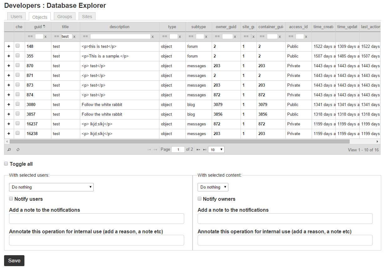 Database explorer tool for Elgg. hypeDBExplorer collects Elgg entity information spread across multiple tables, and presents it in a human-readable format.