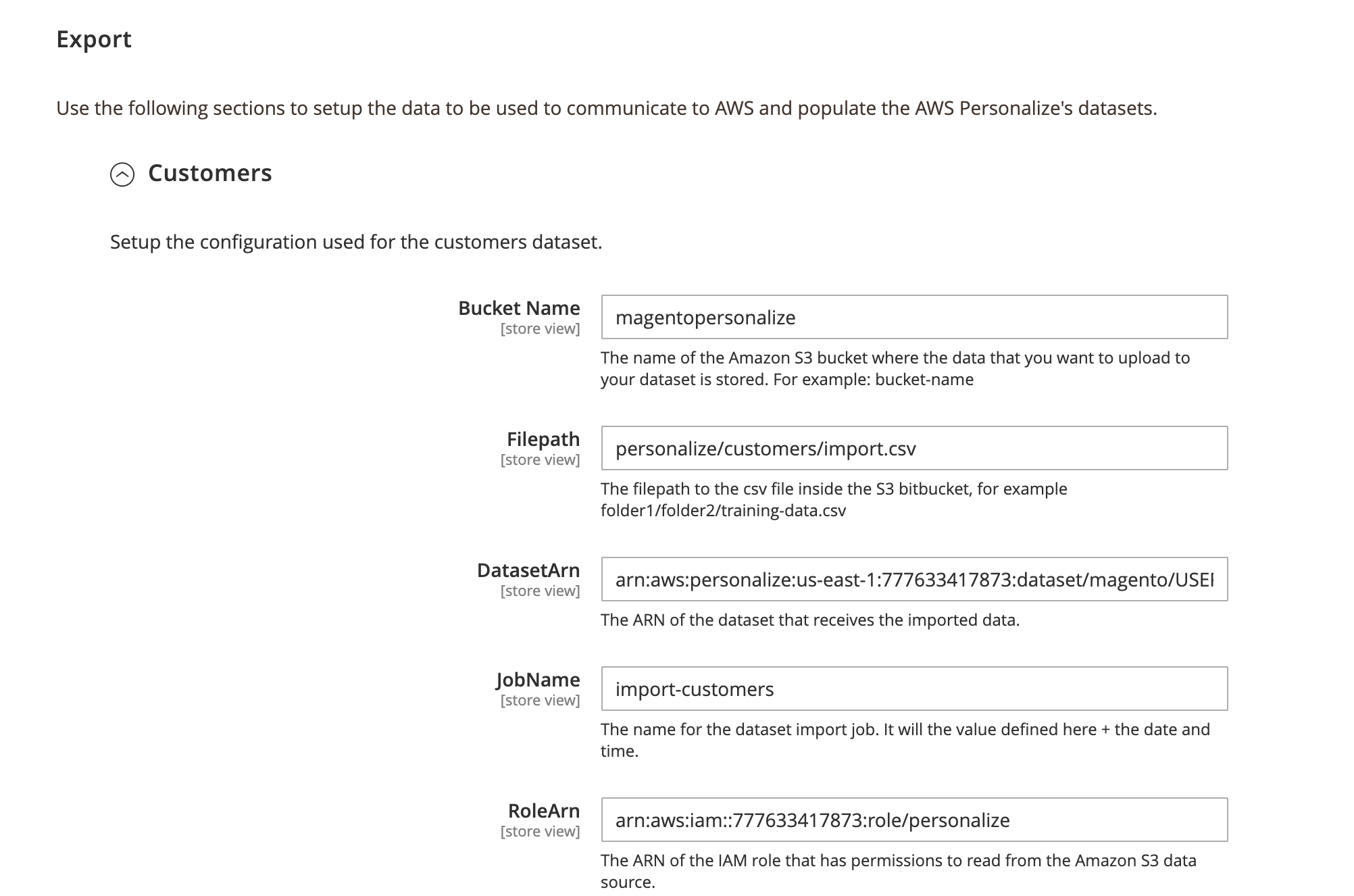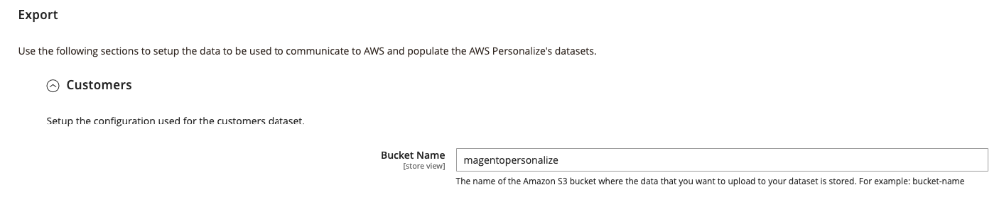 You will need to also setup a S3 bucket that will be responsible to receive the exported data from Magento. It will stored as csv files on S3 and Personalize will read these csv files to import the data. Once you created the S3 bucket you will need to setup the S3 config on Magento admin for each export profile.