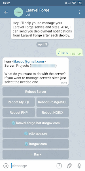 Another awesome feature is sending deployment notifications from Laravel Forge to you or any other chat. Using this ability only one member of your team will manage servers in his private chat with the bot, but all members will receive deployment notifications in your team chat.