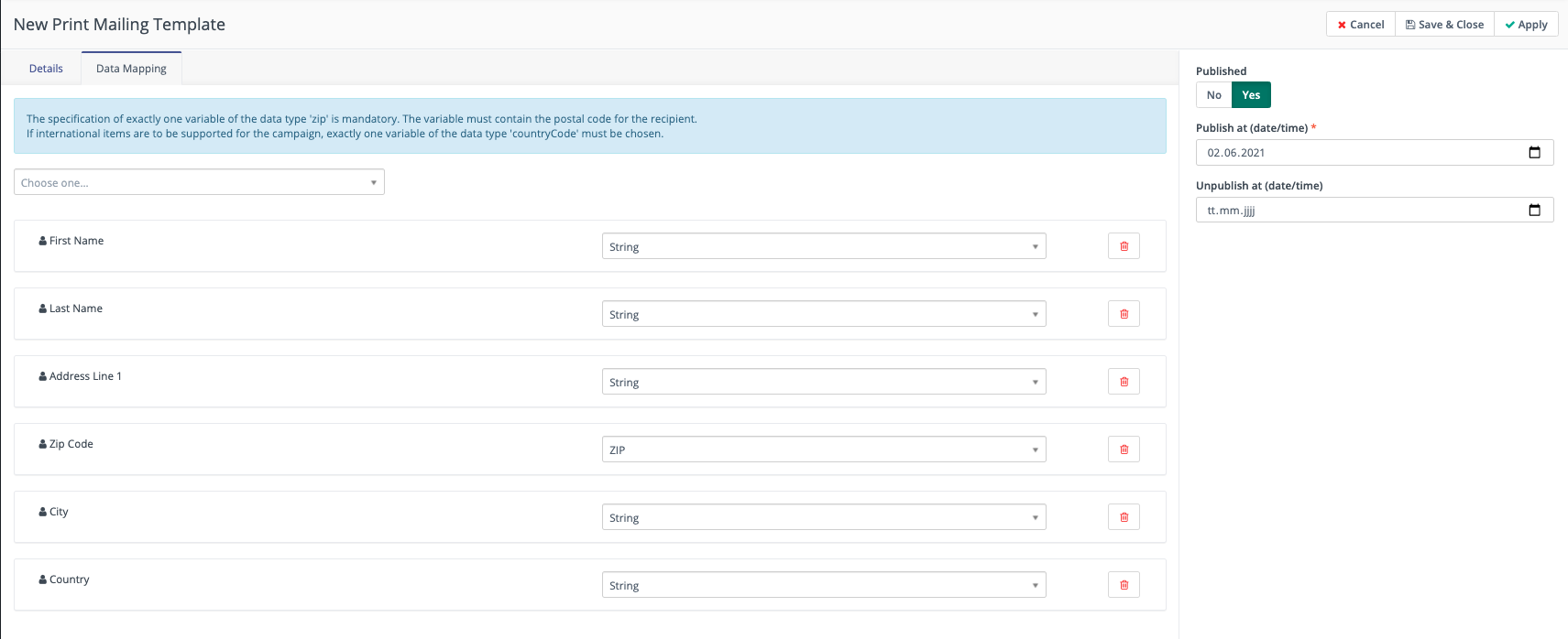 In the tab "Data Mapping", the desired data can be selected for transfer when a postcard is initiated. One field of type "Zip code" is mandatory; and of course that complete address data is required for successful postal delivery. Therefore, a basic set of data is already pre-assigned in every new template (which can of course be changed).