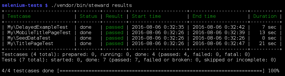 Similar output in the command line interface can be obtained using the ./vendor/bin/steward results command (see below). You can also add -vvv to see results of each individual test.