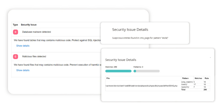 Run automatic scans with our Magento Security Scanner to detect harmful patterns and suspicious files before they’re activated. Find threats early and neutralize them instantly.