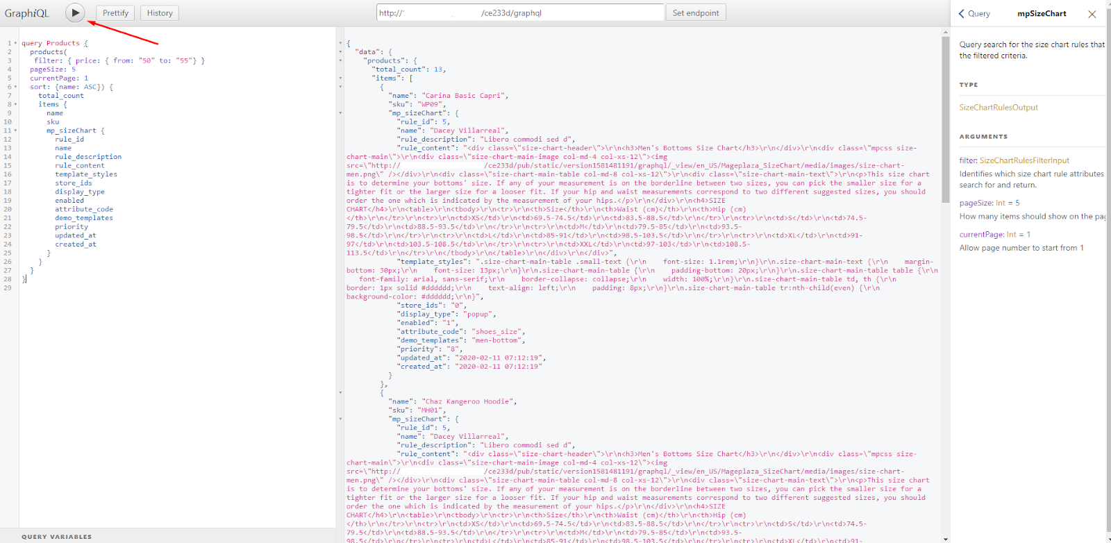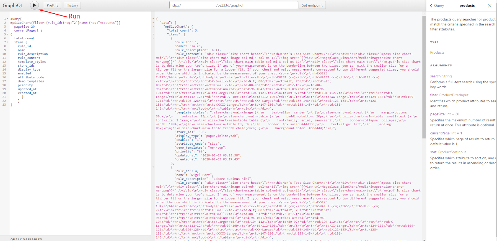 in url box, click Set endpoint. (e.g. http://develop.mageplaza.com/graphql/ce232/graphql) - Perform a query in the left cell then click the Run button or Ctrl + Enter to see the result in the right cell