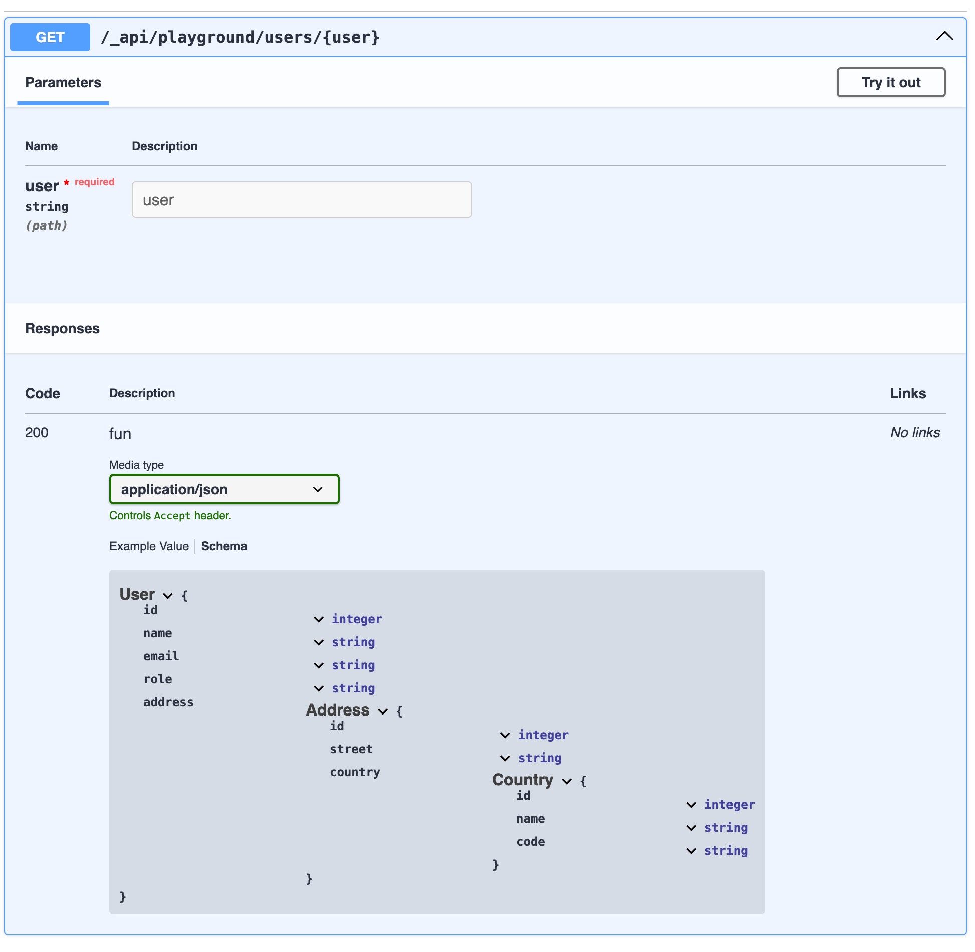 Userschema for both request and response types. - Since your User model has relationships (like Address and Country), it recursively generates schemas for those related models too — so your OpenAPI spec and TypeScript types reflect the complete data structure.