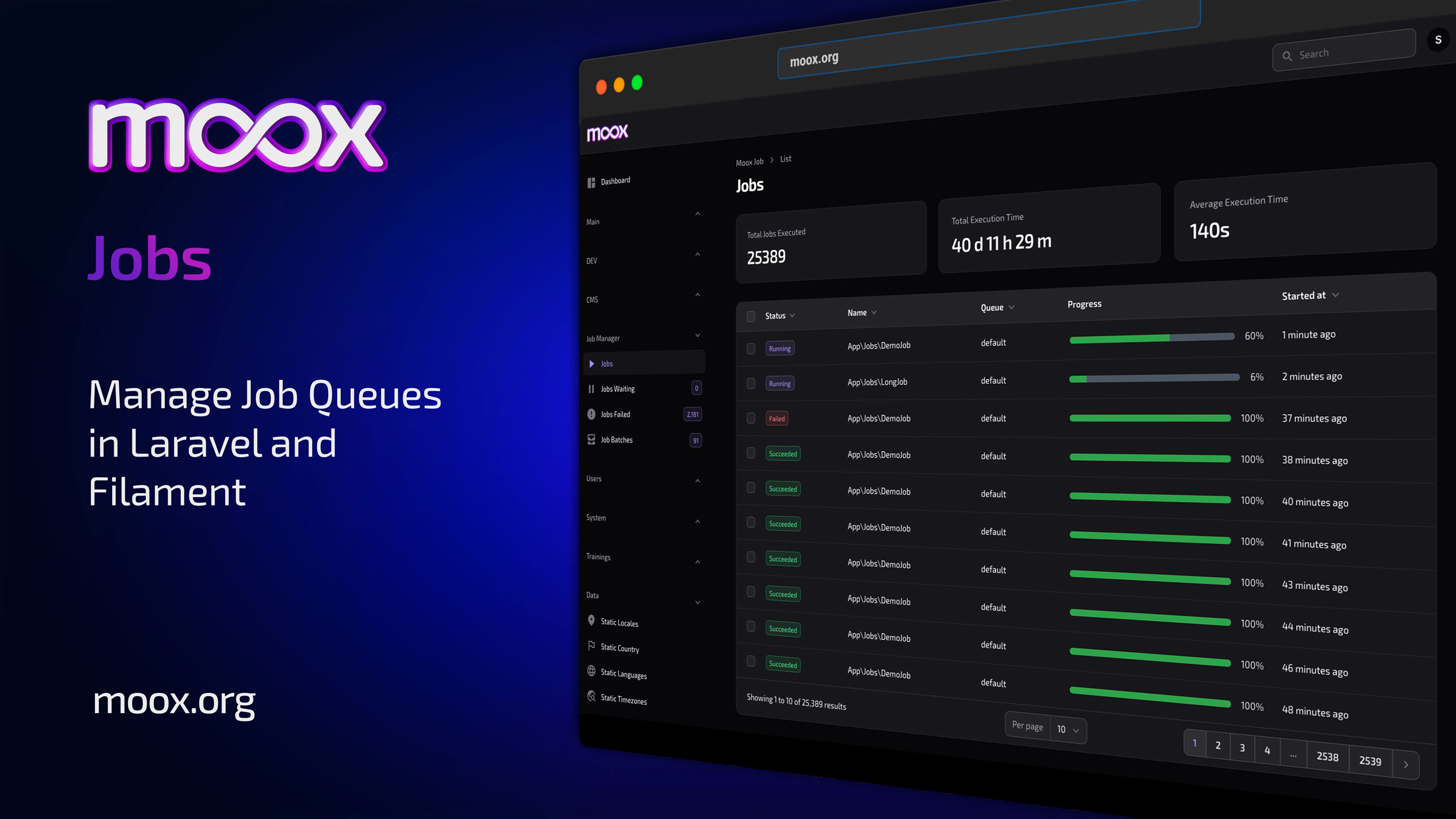 - Your jobs will not run without Moox Jobs installed, when using the progress feature. If your jobs are part of an installable package, you should consider requiring Moox Jobs with your package.