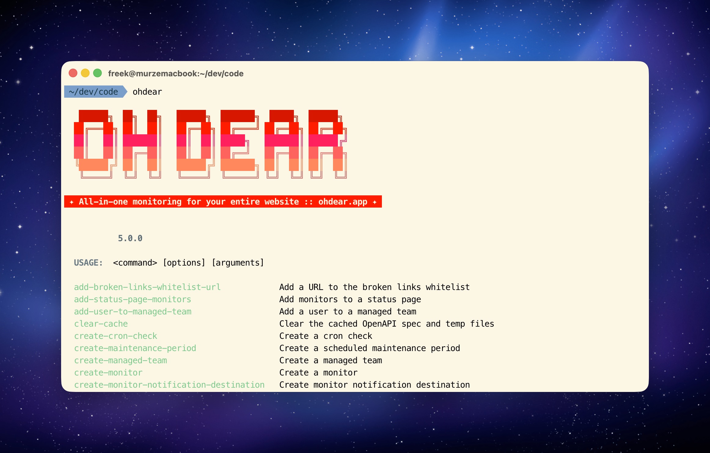 Oh Dear CLI is a command line tool to manage Oh Dear website monitoring. Built with Laravel Zero, it auto-generates commands from the Oh Dear OpenAPI spec so every API endpoint is available as a CLI command.