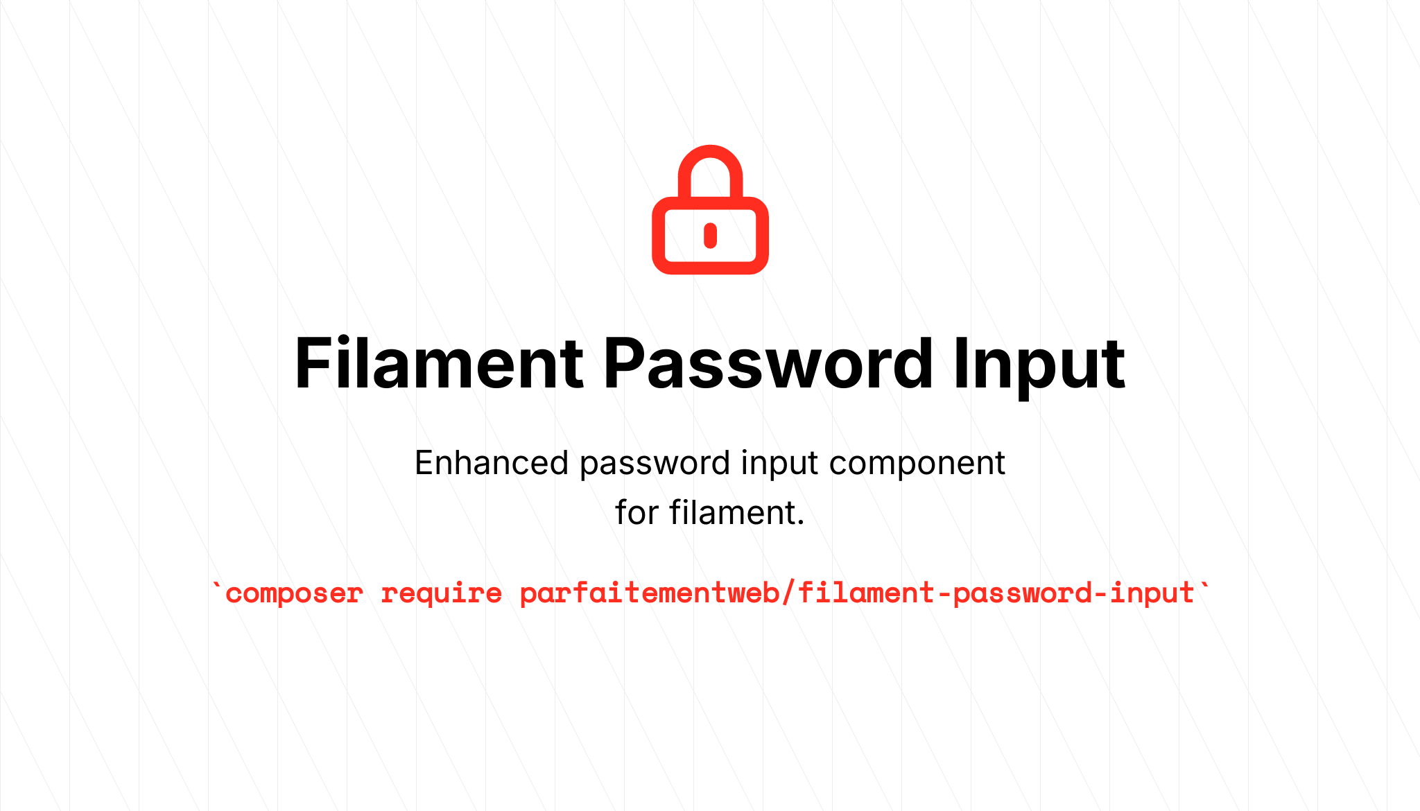use Parfaitementweb\FilamentPasswordInput\Password; use Filament\Forms\Form; public function form(Form $form): Form { return $form ->schema([ // ... Password::make('password') ->label('Password'), ]); }