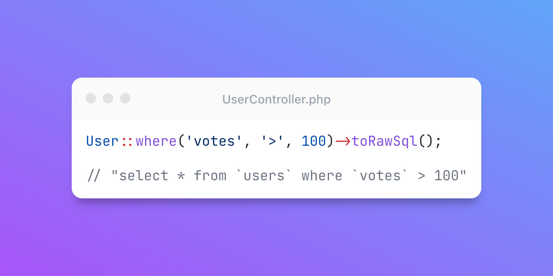 DB::table('users') ->whereBetween('votes', [1, 100]) ->toRawSql(); // "select * from `users` where `votes` between 1 and 100"