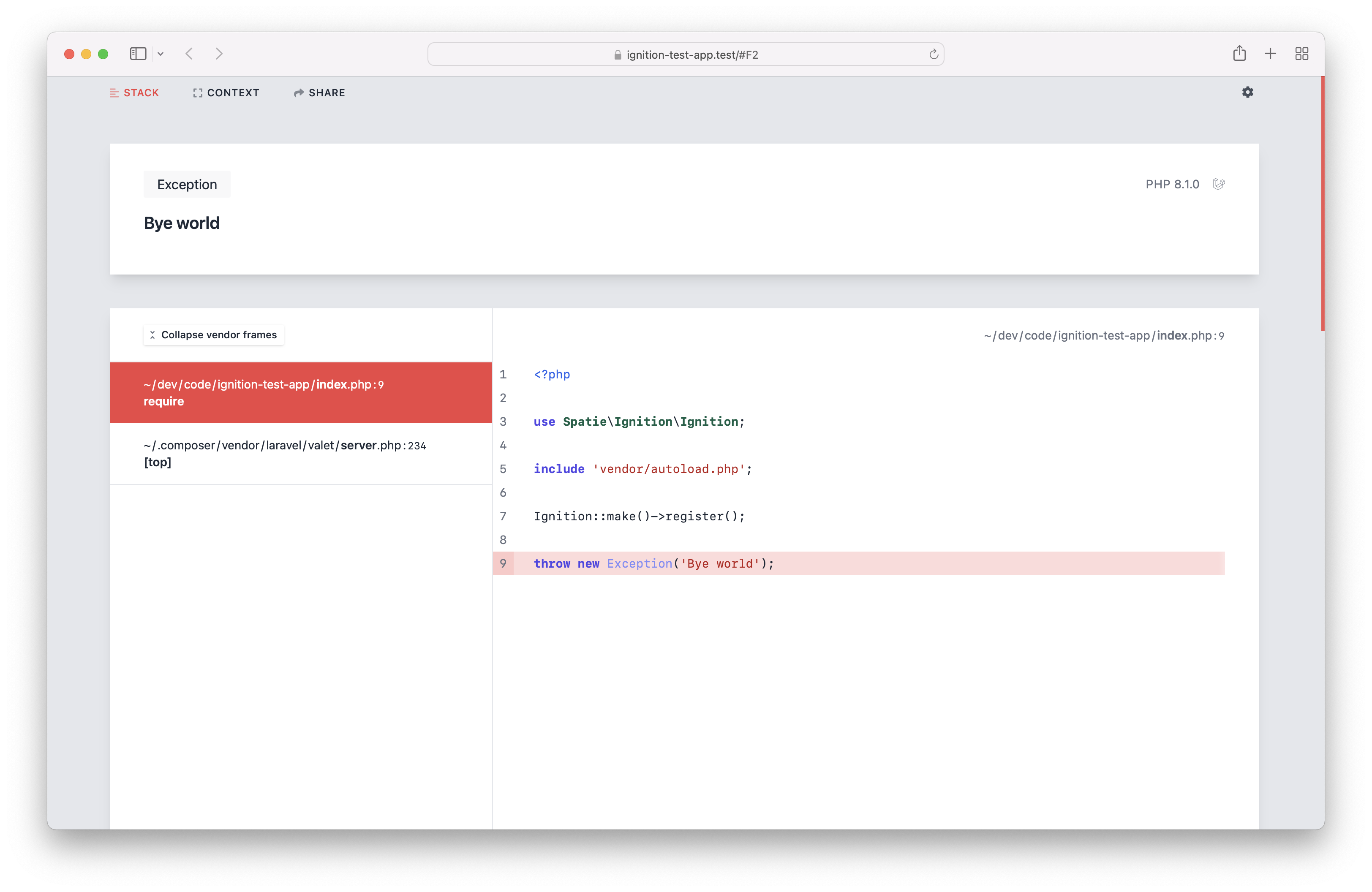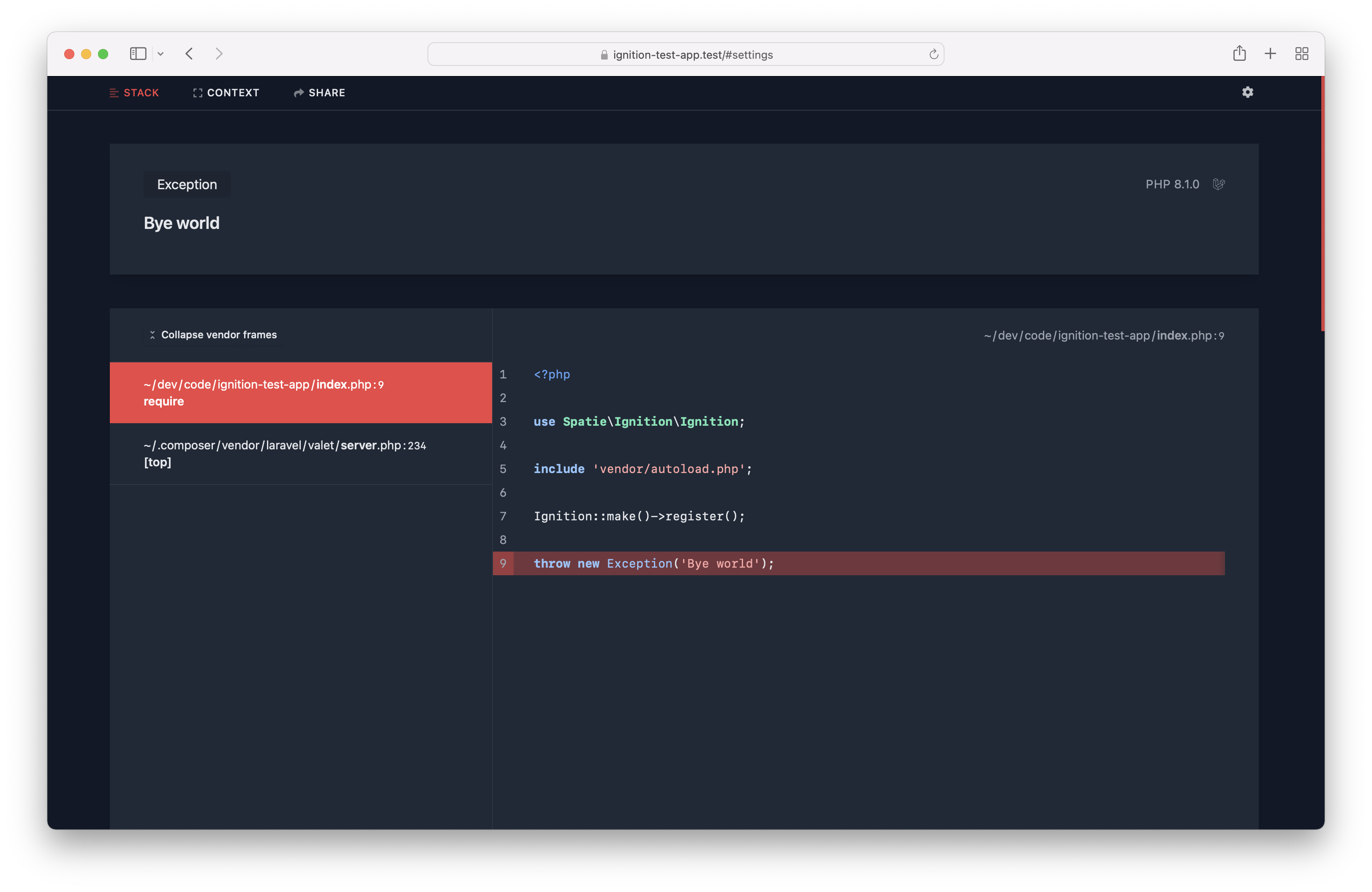 valet parkinside the~/code/flaredirectory.- http://ignition-test.test/ has a bit of everything