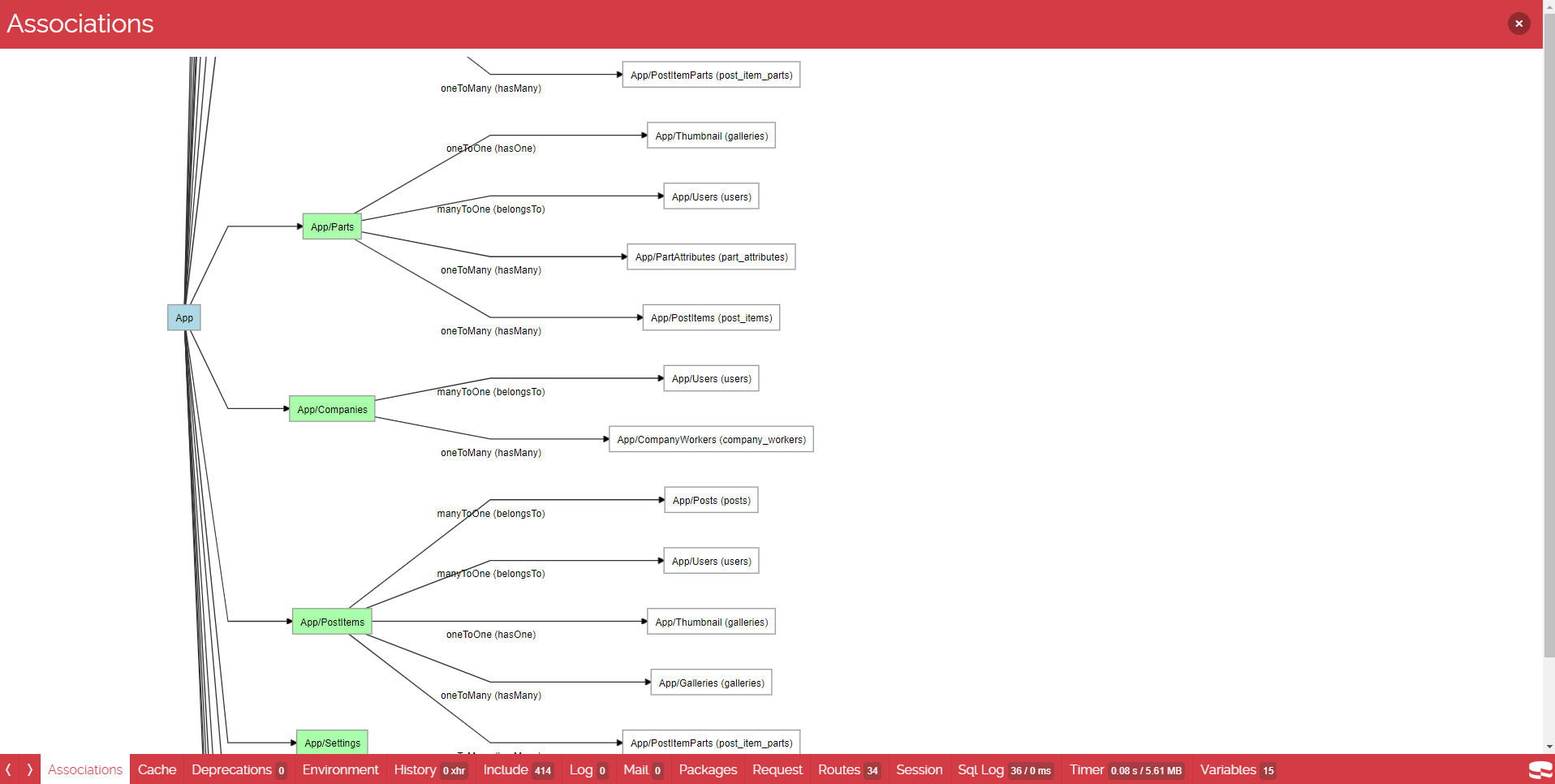 AssociationsDebugger is a plugin that is made for debugging associations. The point of this plugin is to quickly show different associations of your CakePHP application without you needing to browse through the model files.